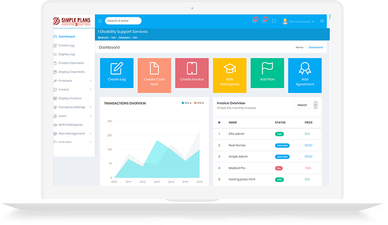 SimplePlans (SP) strives to achieve Industry Best Practice Standards. Both Service modules and Compliance Modules were designed and developed by the overarching NDIS compliances and Standards. Direct Scheduler, SIL Scheduler, Case Notes, Log Notes, Invoice Module, Bulk upload Claims, Shift Notes, ABC charts,ABA-Payment Processing, Risk Assessment, Incident Management, Complaint & Feedback Management, Resource Management, etc are some of the modules.